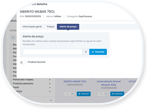 A Central de Compras da Hiper Retail está equipada com um sistema de alerta de preços, que permite aos parceiros serem notificados sempre que um produto atingir um preço igual ou inferior ao definido por estes. Assim garante-se que não perdem as melhores oportunidades.
